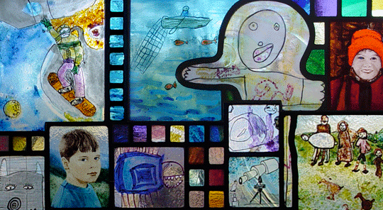 This is a detail of a window for my friend Maura Hawkins made from hers sons' children's art and some photos of Eli, Stuart, and Wyatt. Original stained glass art by Joseph Tracy