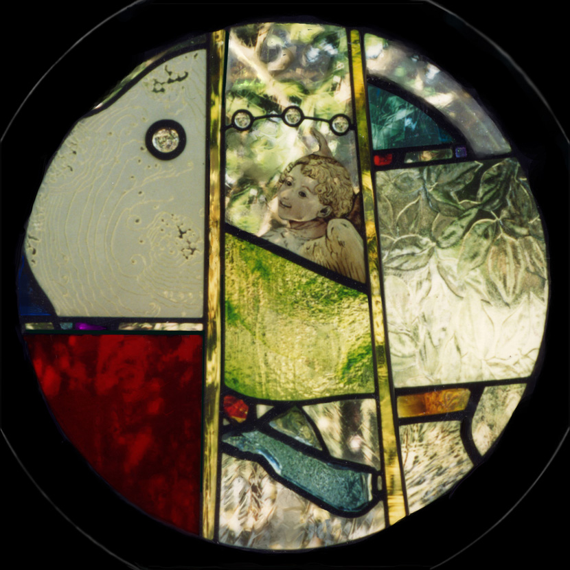 This is the first window where the composition began by arranging glass on a light table and not by drawing. There are several chunks of thick dalles de vere glass included and the painted glass is from a painting by Fra Lippo Lippi. Original stained glass art by Joseph Tracy of Brookside Glassworks (sold)