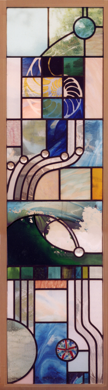 22" x 75" including frame. This window traces back to living in Arcata CA, close to the ocean, with a theme of waves, particles and wave forms in oceanic colors. WFS* by Joseph Tracy