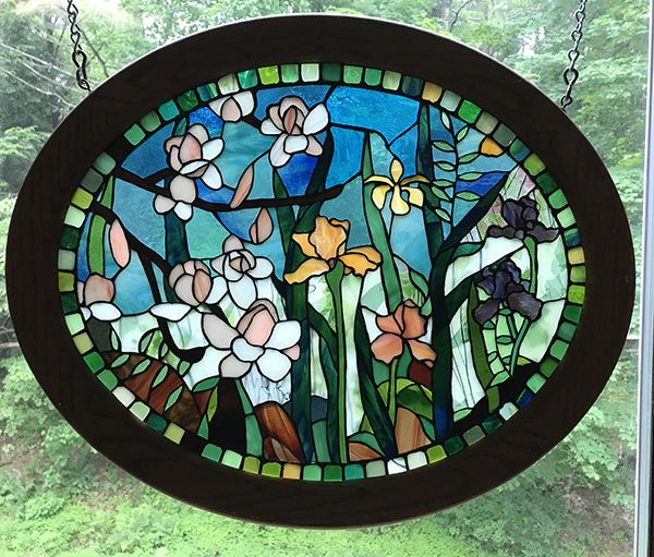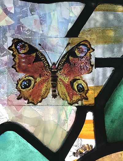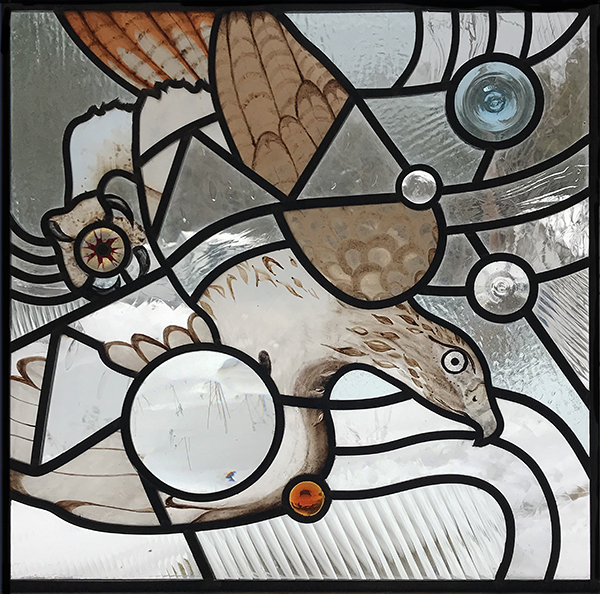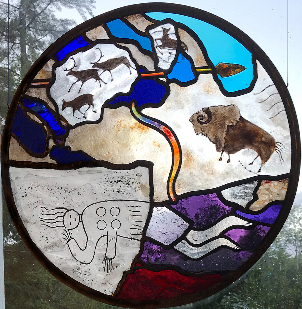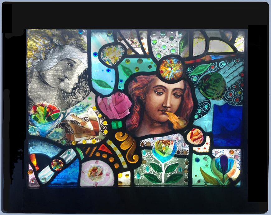 The dictionary says a palimpsest is something reused or altered but still bearing visible traces of its earlier form. In the stained glass tradition many times only parts of windows remain- a face, heraldry, decorative leaves, words. So sometimes in restoring windows craftspeople take wht they have and add new stuff or add more old stuff from a different source. Sometimes windows are made entirely of leftover parts. This started that way and just kept getting tinkered with. original glass art by Joseph Tracy (sold)
