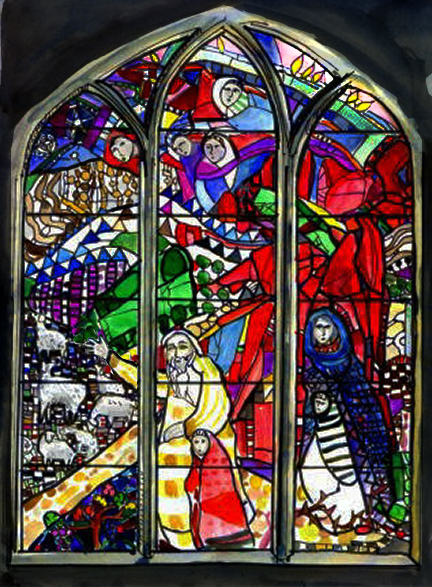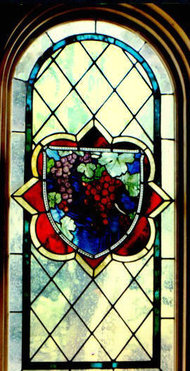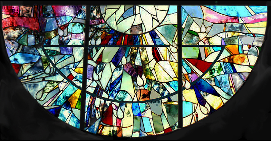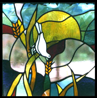PENTECOST St. Matthias Episcopal of San Ramon CA ( approximately 12 feet wide) In this window I was seeking to unify some key visual images of the new testament: the cup and bread; the cloven tongues-of-fire descending from the light of spirit; and a boat or ship with a sail. The curving horizonal lines recall the rolling hills of this area.
