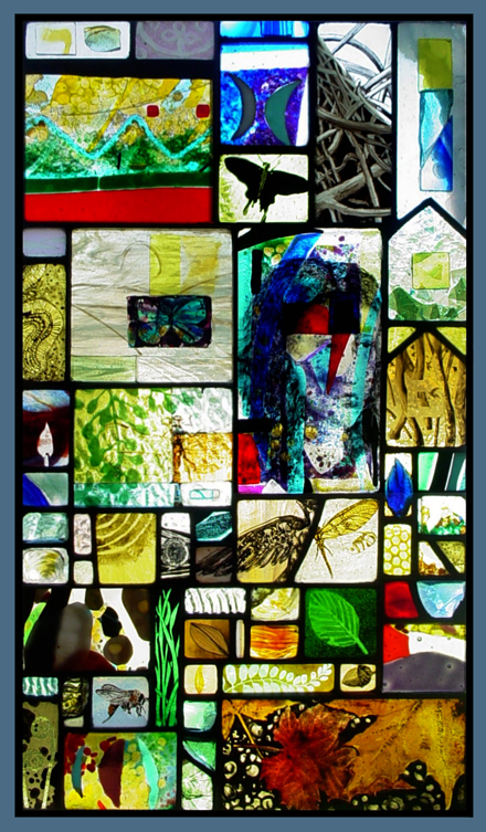 This is the first window where the composition began by arranging glass on a light table and not by drawing. There are several chunks of thick dalles de vere glass included and the painted glass is from a painting by Fra Lippo Lippi. Original stained glass art by Joseph Tracy of Brookside Glassworks (sold)